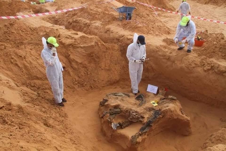 وأوضحت وزارة العدل بحكومة الوفاق الوطني أن الجثامين التي جرى انتشالها من المقابر الجماعية التي عثر عليها بمشروع الربط في ترهونة منها «ستة معصوبة الأعين ومكتوفة الأيدي».