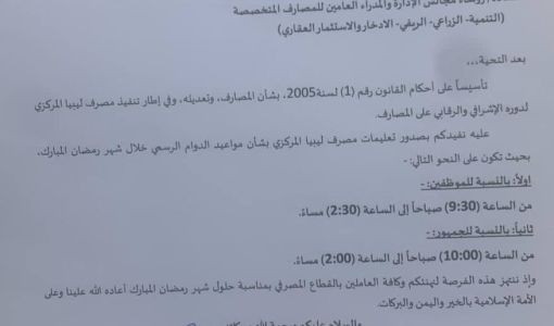 صرح مصدر خاص بمصرف ليبيا المركزي لقناة “تبادل” اليوم الثلاثاء بصدور تعليماته للمدراء العامين للمصارف و لرؤساء مجالس الإدارة العامين للمصارف المتخصصة مثل، التنمية، الزراعي، الريفي، الادخار والاستثمار العقاري، بشأن مواعيد الدوام الرسمي خلال شهر رمضان.