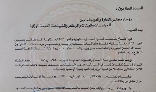 اصدر وزير الصناعة والمعادن “احمد ابوهيسة” بحكومة الوحدة الوطنية ، اليوم الاربعاء منشور بشأن قيام بعض الجهات التابعه بإبرام عقود واتفاقيات استثمار وايجار وتخصيص مواقع دون أخذ الإذن من الوزارة، والذي يطلب فيه اخطار الوزارة بأية تعاقدات تمت في السابق لمراجعتها والتحقق من صحتها تمهيدا لاعتمادها وأخذ الاذن الكتابي من الوزير.