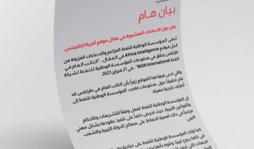 أصدرت المؤسسة الوطنية للنفط بيان اليوم الخميس ، نفت فيه المزاعم والادعاءات المزيفة من قبل موقع Africa Intelligence في المقال ، “النائب العام في طرابلس يحقق في مدفوعات المؤسسة الوطنية للنفط لشركة النفط BGN International” ، في 21 فبراير 2023.