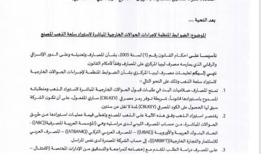 اصدر مصرف ليبيا المركزي تعليماته بشأن الضوابط المنظمة لاجراءات الحوالات الخارجية لاستيراد سلعة الذهب، للمصارف، النوران، والخليج الاول الليبي، والصحاري، بمنحهم صلاحيات البث في طلبات قبول الحوالات الخارجية المباشرة لاستيراد الذهب ومتطلباته المسموح بها قانونا، وذلك بتوفر رمز مصرفي ” CBLKEY”,ساري المفعول.