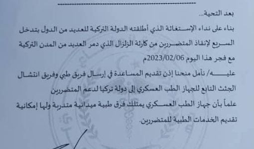 أعطى رئيس حكومة الوحدة الوطنية “عبدالحميد الدبيبة” اليوم الاثنين الإذن لجهاز الطب العسكري بإرسال فريق طبي وفريق انتشال الجثث التابع للجهاز إلى دولة تركيا لدعم المتضررين من الزلزال الذي دمر عدة مدن تركية فجر اليوم، وذلك بعد أن اصدر بيان من قبل مدير الجهاز “ابراهيم الرايس” لتقديم المساعدة.