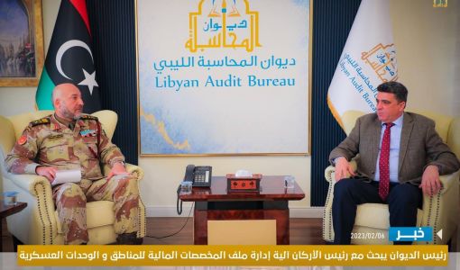 ناقش رئيس ديوان المحاسبة “خالد شكشك” يوم الاثنين بمقر الديوان مع رئيس الأركان العامة آمر المنطقة الجنوبية” محمد الحداد” و مدير إدارة الحسابات العسكرية و الإدارات المختصة بالديوان ، بعض الملفات من بينها ملف تعثر صرف مرتبات أفراد المنطقة العسكرية الجنوبية، وكذلك آلية تسييل مخصصات المناطق و الوحدات العسكرية و ضمان انسيابها بما لا يؤثر سلباً على آدائها.