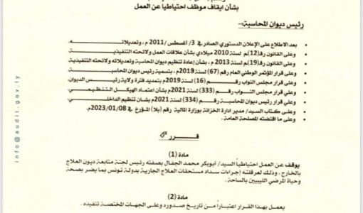 حيث اصدر ديوان المحاسبة القرار رقم 6 لسنة 2023 والذي ينص بايقاف رئيس لجنة متابعة ديون العلاج بالخارج لعرقلته اجراءات سداد مستحقات العلاج الجارية بدولة تونس بما يضر ب…