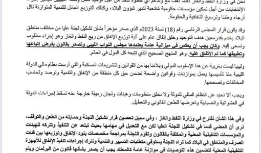 نشرت وزارة النفط والغاز بحكومة الوحدة الوطنية بيان لها اليوم الثلاثاء، بخصوص قرار المجلس الرئاسي، بشأن تنظيم و متابعة الإنفاق العام، والذي اقترحت فيه المضي قدماً في تشكيل اللجنة العليا مع التعديل في مهامها بحيث تبتعد عن التنفيذ وتتركه للهيئات والمؤسسات التنفيذية والمكلفة بالقانون، موضحة بأن تقوم هذه اللجنة على بمراجعة مخصصات بنود الانفاق وتوزيعها بين فئات الصرف والمناطق في البلاد.